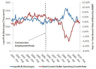 This figure shows that construction employment reached a peak in April, 2006 and started descending thereafter. The housing recession was on, but remarkably employment in the rest of the economy continued to grow through early 2008. In fact, layoffs and discharges did not dramatically change during this almost 2-year period as seen below: