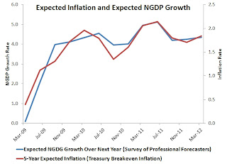 Update: Given my claims above, I was curious to see how close the TIPS-created expected inflation series tracked the nominal GDP forecasts provided in the quarterly Survey of Professional Forecasters. To do this, I transformed the 5-year expected inflation series into a quarterly average and plotted them against the forecasted growth of nominal GDP over the next four quarters. Here is what I got: