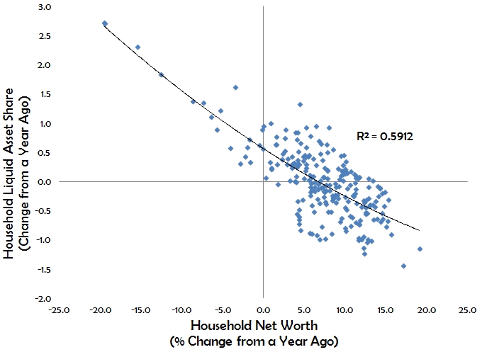 There is a strong negative relationship here that suggests positive household money demand shocks tend to pull down household net worth.  And currently households are maintaining unusually high shares of liquid assets in their portfolios, indicating there has been series of positive money demand shocks: