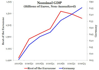 Now maybe the German public does appreciate what is going on in the Eurozone, but simply are not fazed by it. One reason for this might be their belief that they can force the rest of the Eurozone to become more German-like as this "we have them by the balls" comment indicates. A second reason is that in a worst-case scenario the Eurozone breaks up and they return to their beloved Deutsche Mark with a relatively resilient German economy. Whatever the motivation may be, what we do know is that the Germans are doing a fine job stabilizing aggregate demand in Germany.