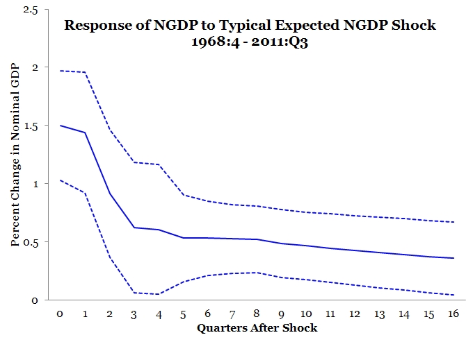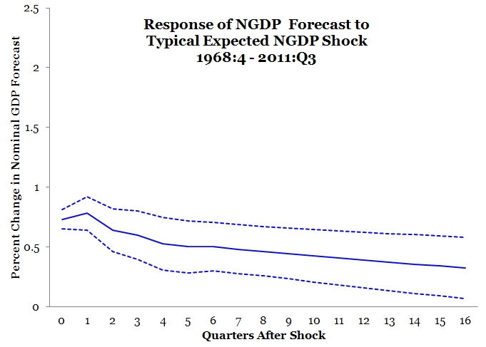 Now the above figure is not what we are really after. What we want to see is the response of actual nominal GDP. But the above figure is important because it provides a way for us to compare the size of the change in the forecasted nominal GDP growth rate to the size of the change in the actual nominal GDP growth rate following such a shock. So what does the typical, actual nominal GDP growth rate response look like? Here is the answer: