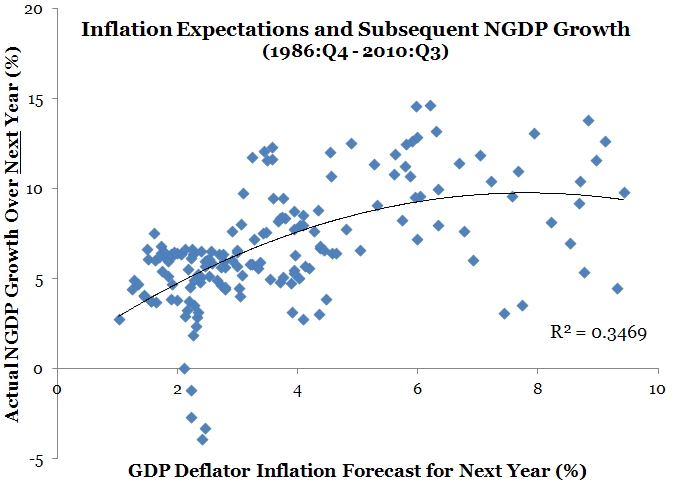 Second, it is fairly straightforward to empirically demonstrate that both inflation expectations and nominal spending expectations have been important to current nominal spending. This can be done using the quarterly Survey of Professional Forecasters from the Philadelphia Fed. This survey has inflation and nominal GDP forecasts for the next five quarters that go back to 1968:Q4. The next two figures show that if one takes the average forecast for the next four quarters and plots it against the actual subsequent nominal GDP growth that occurred over the next year there is a systematic relationship: